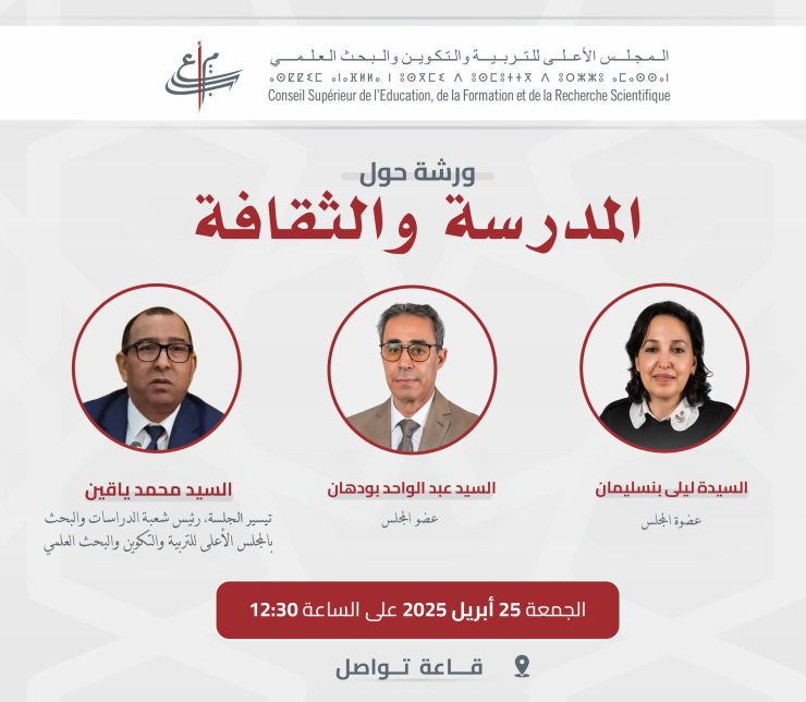 ينظم المجلس الأعلى للتربية والتكوين والبحث العلمي، خلال مشاركته في المعرض الدولي للنشر والكتاب، ورشة فكرية حول “المدرسة والثقافة”، يُسيرها السيد محمد ياقين، رئيس شعبة الدراسات والبحث بالمجلس، وسيُلقي مُداخلاتها…